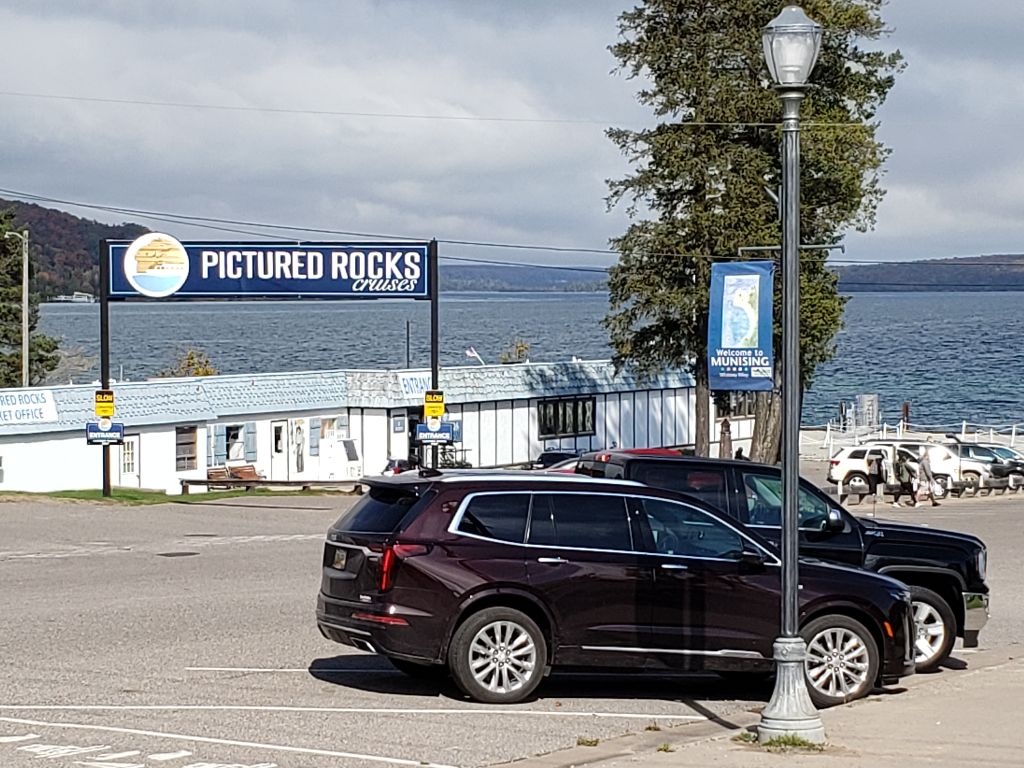 Headed north to Munising. Home of the Painted Rocks National Park. Tourist season is winding down. Quite a few Chinese queuing up for the boat tours. Lunch at eh! Burger. A smash burger type place down by the piers. Business was brisk. Nice in the sun. Ate outside. Lost Irena again. Saw something shiny I think. :-).