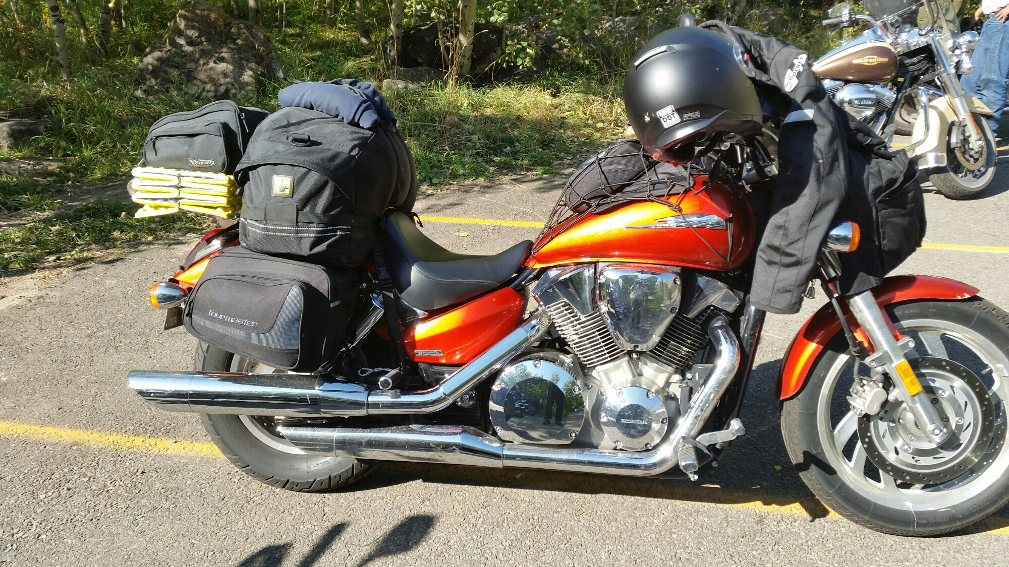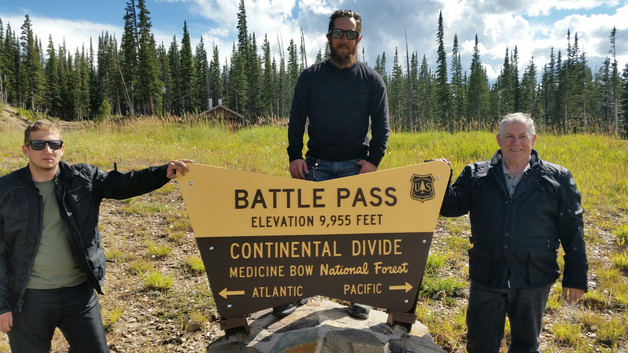 60 miles or so of beautiful ranch country. Took our time. Stopped at the IGA in Saratoga. Picked up some ribeyes, asparagus and salad for dinner. A couple of bottles of bottom shelf, but fully workable spirits. Oh yeah, a bag of potato chips. We actually have been staying away from that stuff as much as possible, but sometimes you just cave in. We got to Mike’s place. At 7600′, and just a few miles from his favorite snowmobiling, its a great staging area. We unloaded the bikes, got right back on them and took off for ‘Battle Pass’. A 10,000 foot pass and continental divide just outside of town. Jonathan rode Mike’s Honda CBX. A vintage 1979 6 cylinder rocket that Mike has been riding on the trip. Borrowed from his cousin Pat who was with us for a few days last week. At any rate a big change from his Yamaha. Fun road. Heck, they all are. Its nice to see the boys develop their riding skills and confidence.