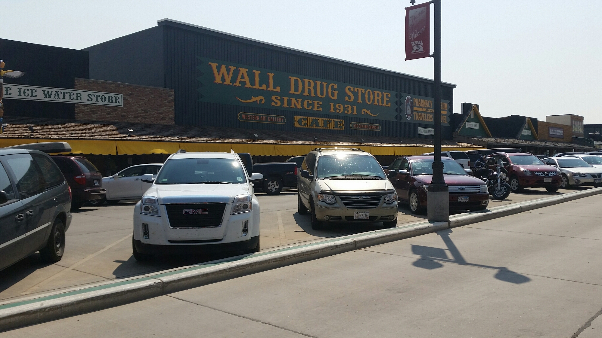 Back on the road we decided to head for the interstate for the sake of time. The interstate was about 75 miles south west and we would be on that for another 70 miles to Sturgis which we decided would be our destination. So we cruised on. OK, I saw all this billboards for hundreds of miles for Wall Drug in Wall, SD. One sign would say ‘5c coffee’, another ‘free ice water’, ‘kids love it, ‘buffalo burgers’, ‘hats’.. You get the idea. So we stopped. Gotta be the biggest tourist establishment in the badlands. It was great. We killed another 45 minutes to an hour there. I bought a pair of gloves (insulated). The guy who waited on me was a law school student from Jamaica. This place is so big they bring in kids from all over to work in the summer. Took some pics with the boys.