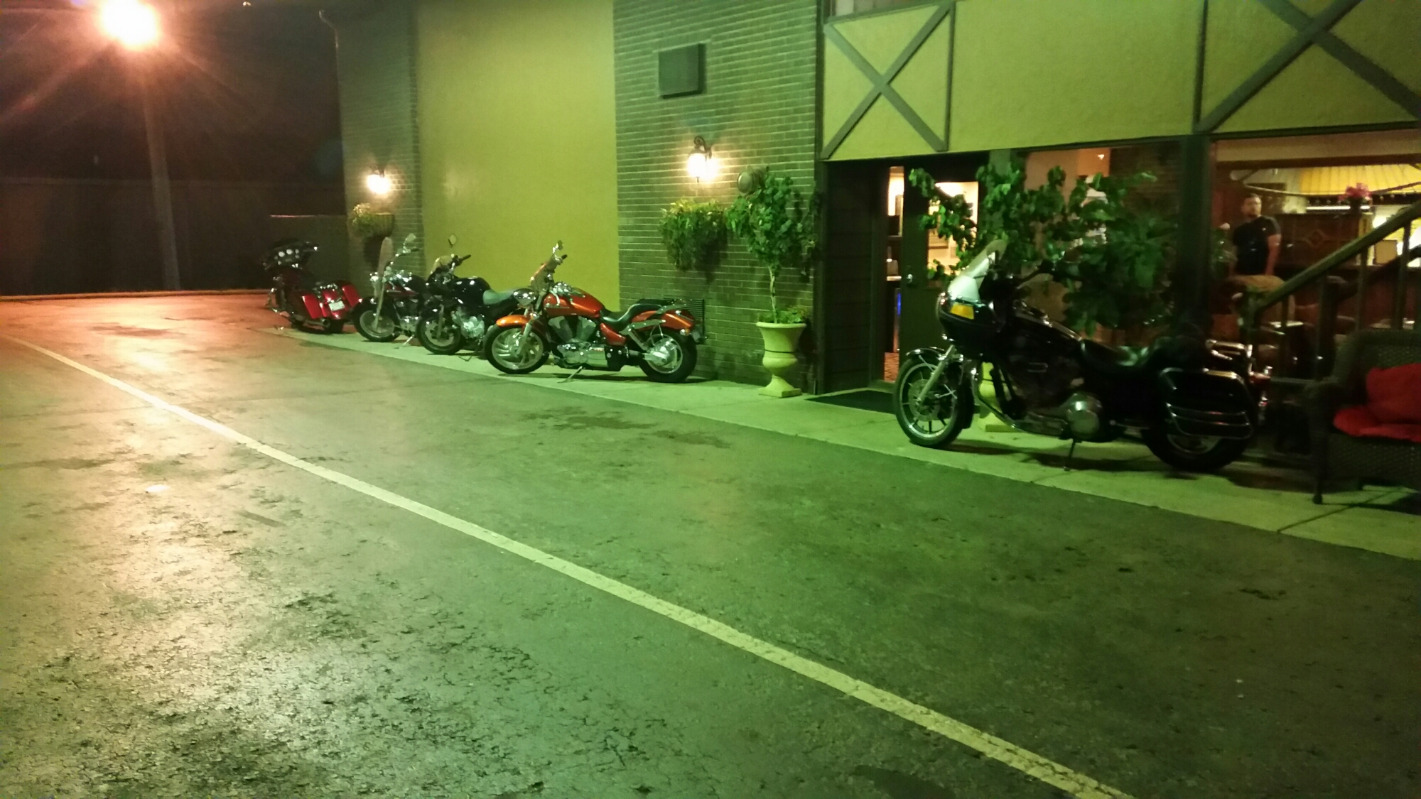 We found fuel about 15 miles from the park and one of those 65mph highways and blasted into the city. Once we got there, got lost temporarily, then got on a road that put us back on the interstate towards Sturgis. An expert turnaround at the next available exit took us back into Rapid City. We found a great motel for $60. They let us park our bikes under the canopy overnight. There was sports bar within walking distance. We ordered food which was brought over from the Bob Evans restaurant next door. We drank, we laughed, we ate and we re-lived the experiences of the day. Karaoke night in Rapid City, SD provided the background entertainment.