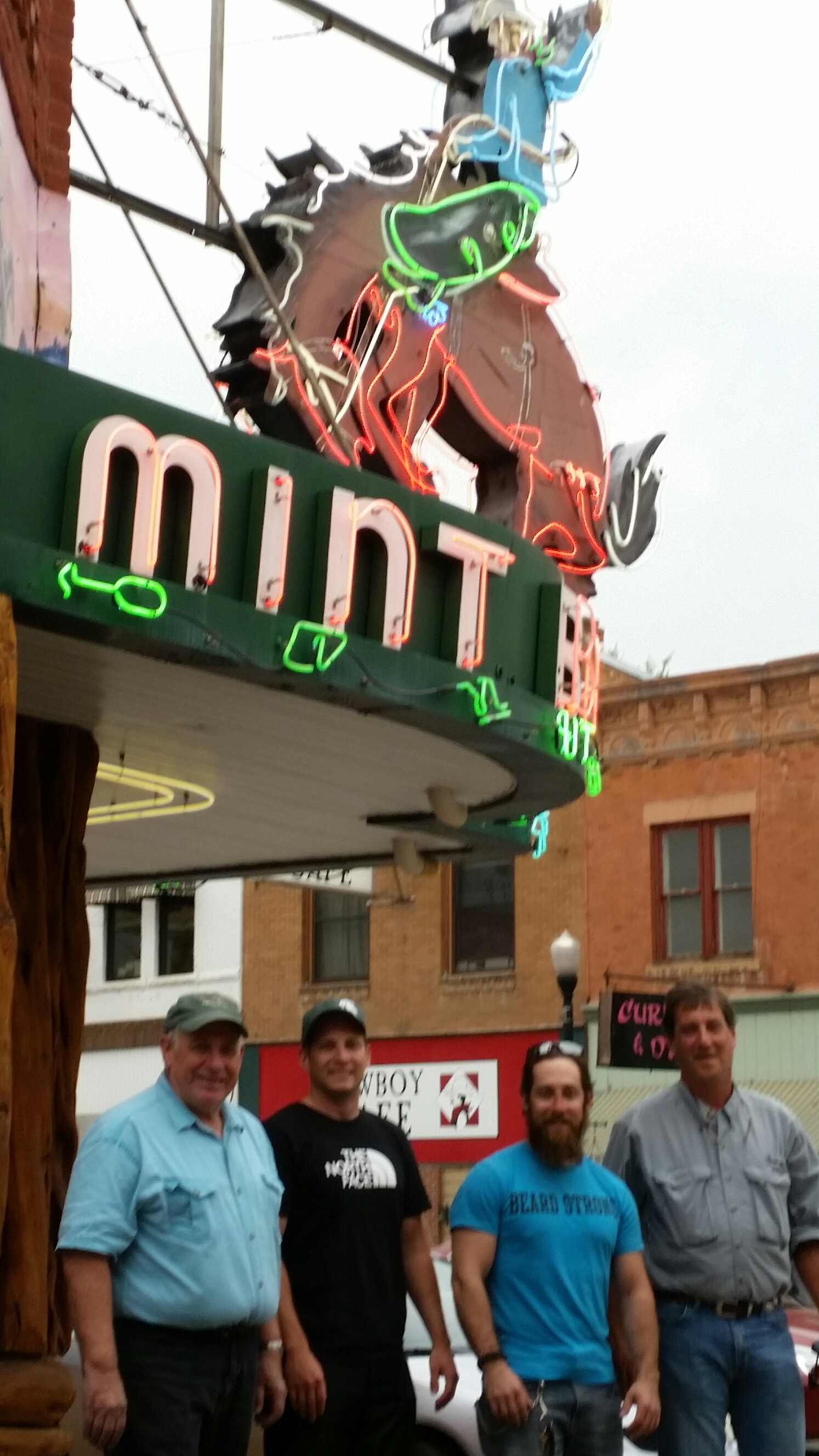 We saddled up and got on the road again. We decided to take the back country up to Sheridan. Mike and his cousin Pat were going to meet us at the Mint bar on Main St. 102 miles. Scrub. Wide open. Really nothing to look at. About mid way Jonathan signaled to pull over. Clearmont, WY. We needed to hydrate. Very hot. Bought some bottles of water at one of the smallest stores we have been in. They had a ‘Cafe’ sign. I think only one table and I saw a George Foreman grill behind the counter.