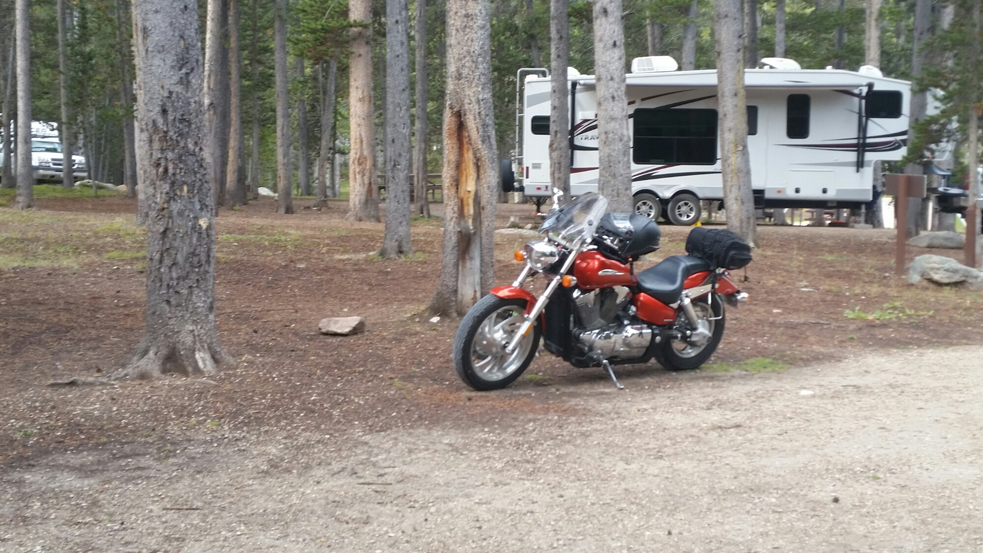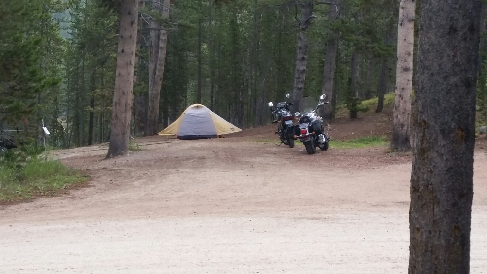 Pulled into Sheridan. Fueled up. Looked for Main St. Found it. Looked for the Mint Bar. Found that. Mike and Pat came out while we were securing the bikes. Big smiles. Heartfelt greetings. Time for a beer. Into the Mint Bar. Decided to head up the mountain and camp. So we loaded up with adult beverages, ice, subway sandwiches and junk food. With the bikes pretty well packed to the brim already, we used cargo nets and straps. Not pretty but functional.