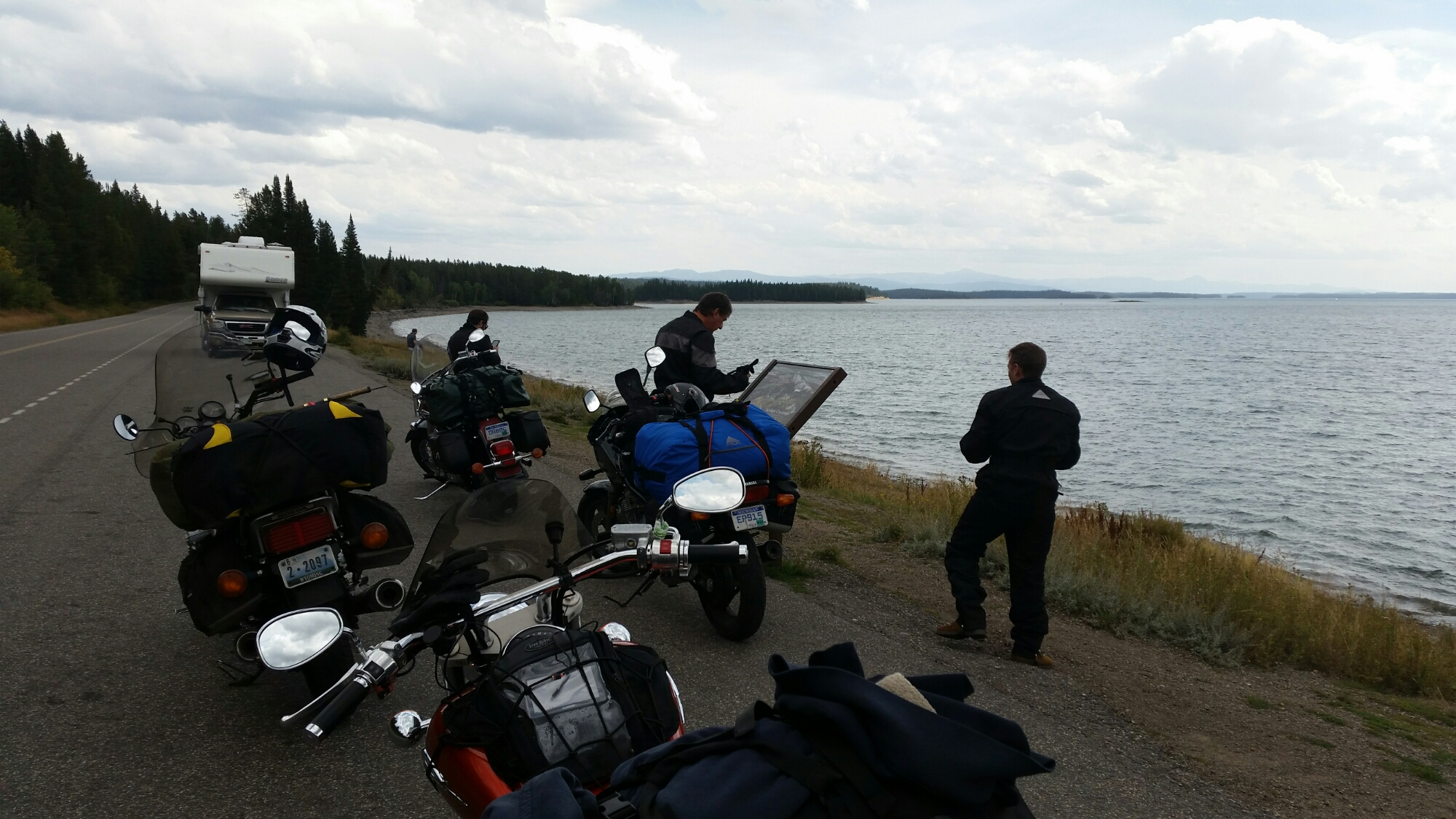 We scooted out of the lot pretty quick before everyone else could load up the strollers and leave. Headed back through the passes and got on the main road heading south. Destination, the Tetons. It took an hour or so to leave Yellowstone. At times we have a tendency to push the speed limit. Like yesterday when an approaching ranger turned on his lights until we slowed down, which we did. Sometimes you just need those gentle reminders.