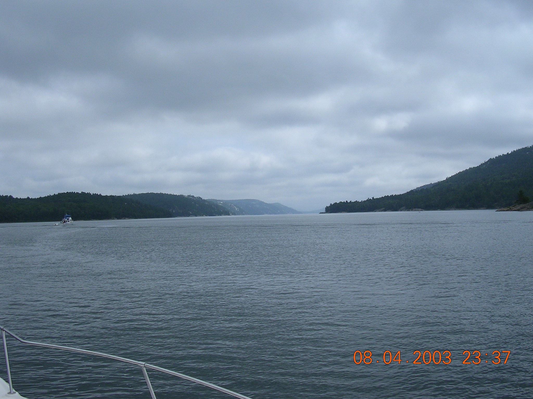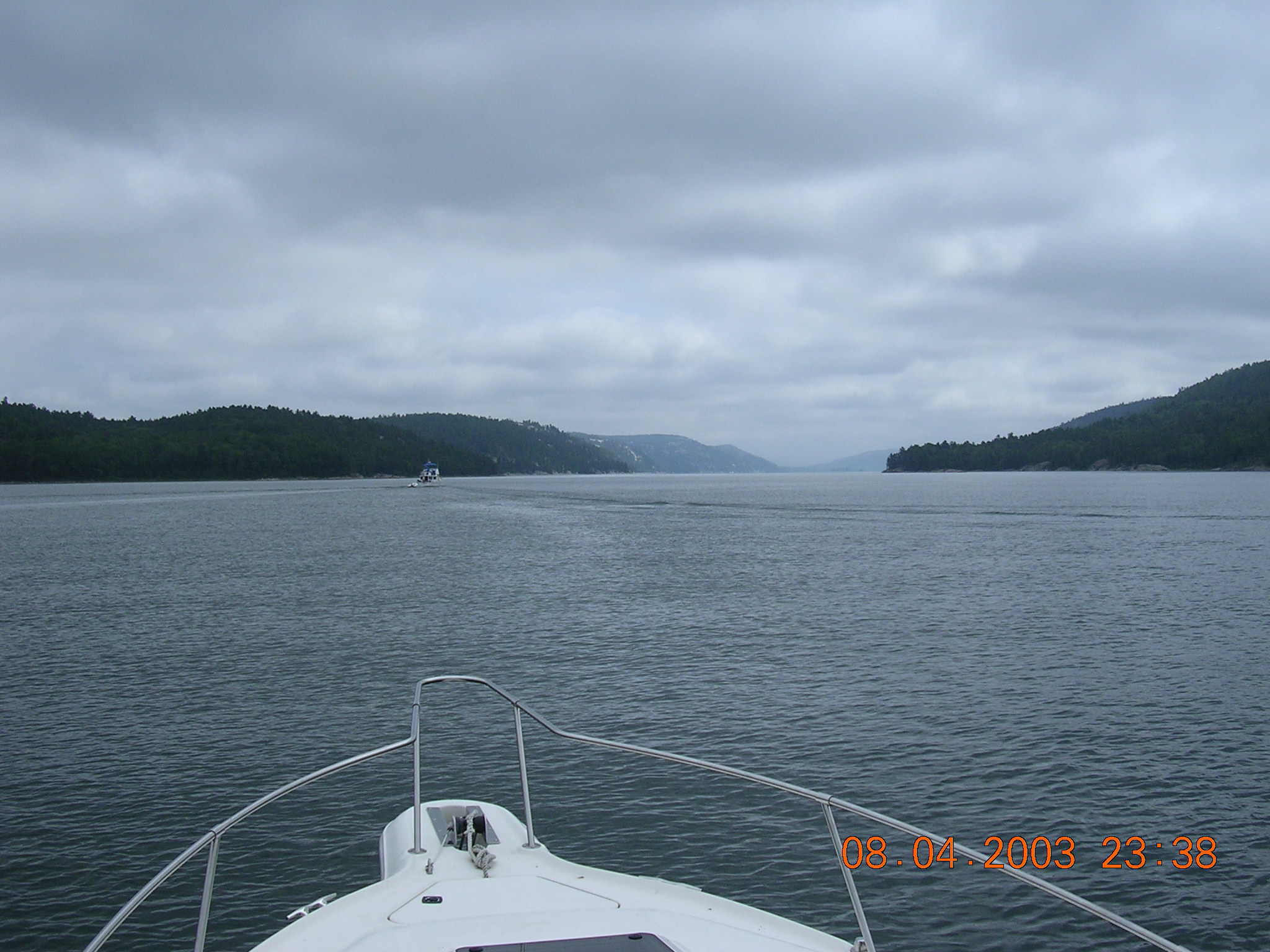 PQ – Decided not to take day trips and to listen to Disco Frankie. We left Killarney and the Sportsman’s Inn. Headed to Baie Fine, a beautiful but narrow passage. Paul had the helm most of the day and navigated the passage from Killarney well. Went through the main channel, fjord and ended up in the pool. Calm but fishing poor there as well. Laddie on the bow looking for rocks a la Katherine Hepburn in ‘On Golden Pond’.