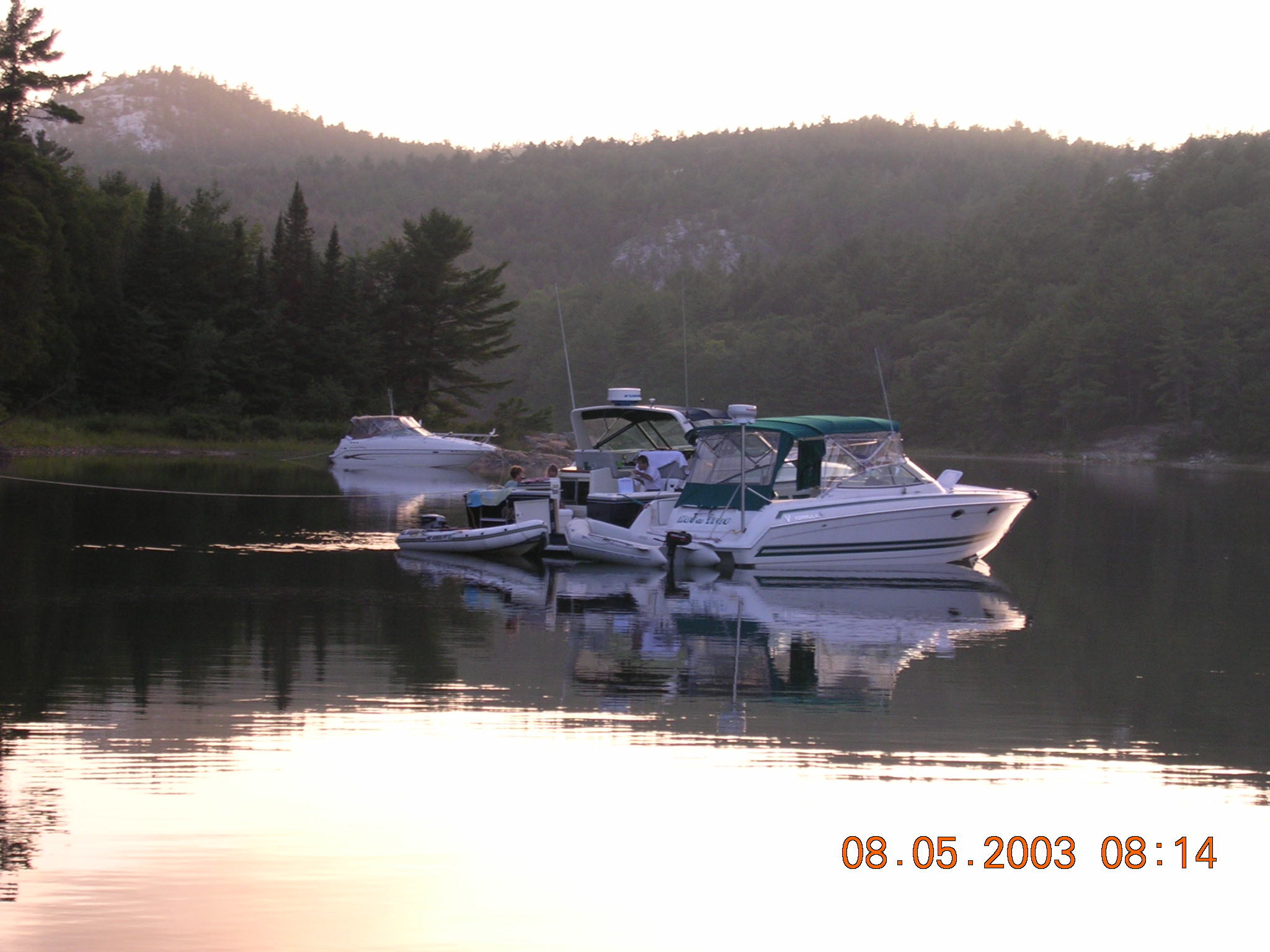 Cool area to swim in a secluded area of the fjord. Fishing poor again. We all caught bait and threw it back. Our neighbor in Killarney who helped us dock, Marty, was moored alongside. Laddie prepared cheeseburgers, zucchini on the alcohol stove.