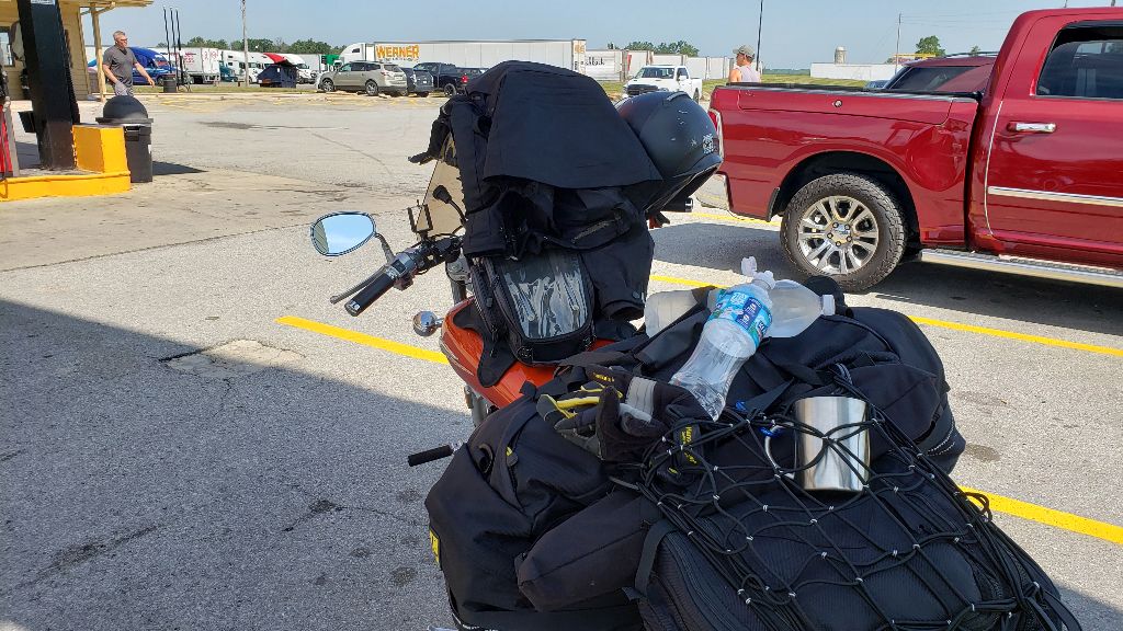 The day heated quickly.  I hit Indianapolis 11ish and it was already in the 90’s.  Stop and go construction on the outer-belt around the city.  South of the city I pushed the bike hard.  Very hard.  South of Bloomington, traffic was very light. Very rural, hilly and 10-15 miles between exits, some with no services.  I usually go 125-150 miles between fuelings.  At about 100 miles, I start thinking about when the next stop will be.  This time I had  about 90 miles on this tank, I had just passed a truck and the bike started sputtering.  It had run out of fuel…  Luckily I have reserve, so I found and flipped the switch under the tank (while still at speed) and it got me to the next gas station.  So I took it easier the rest of the trip.  Lesson learned.  Extended interstate riding burns more fuel.  High speed extended interstate riding burns even more.  I took a break and fueled after that in beautiful Newberry, IN and spent about a 1/2 hour hydrating.