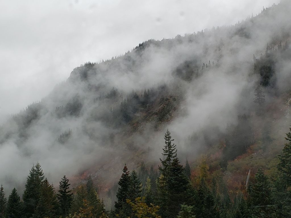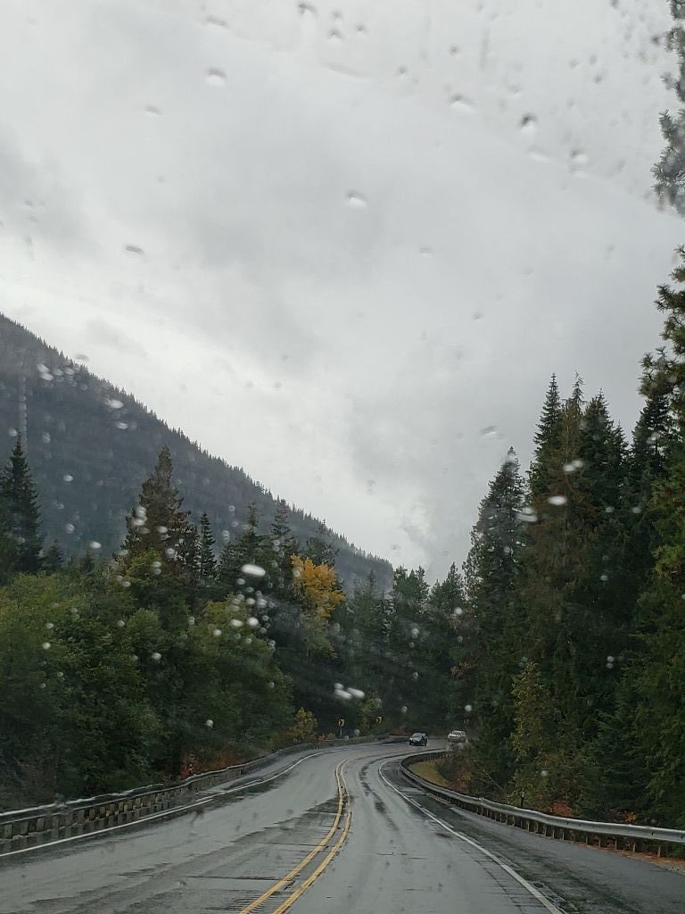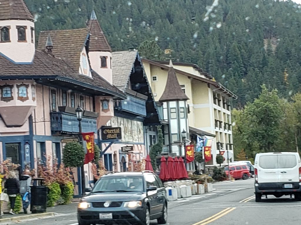 Back on the road and back on US 2 heading west. Less than 100 miles to Seattle. Traffic fairly heavy. Decided to stop in Levenworth. Barvarian themed little tourist mecca about 10 miles down the road. Wow. Went through town. Not really our thing. Nice for senior bus trips and those who like to wear lederhosen. Back on US 2. Road narrowed to 2 lanes. Beautiful drive across the Cascades. Narrow canyons. Stephens pass. 5 or 6 thousand feet. I think. We were a few hundred feet below the snow line. It took us about an hour and a half to come out the other side.